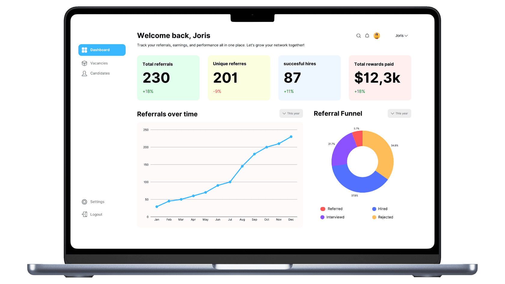Volg direct de beste aandragers, monitor je kandidaten pijplijn en meet de ROI van je programma met één overzichtelijk dashboard.